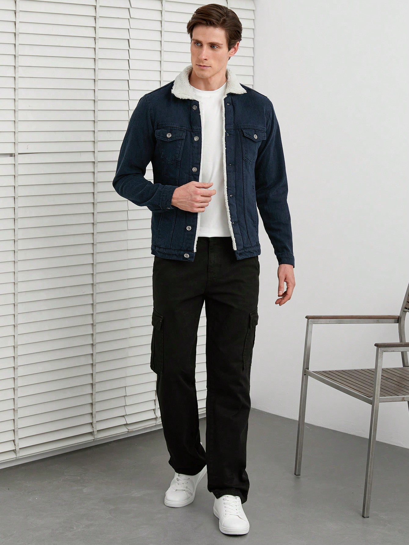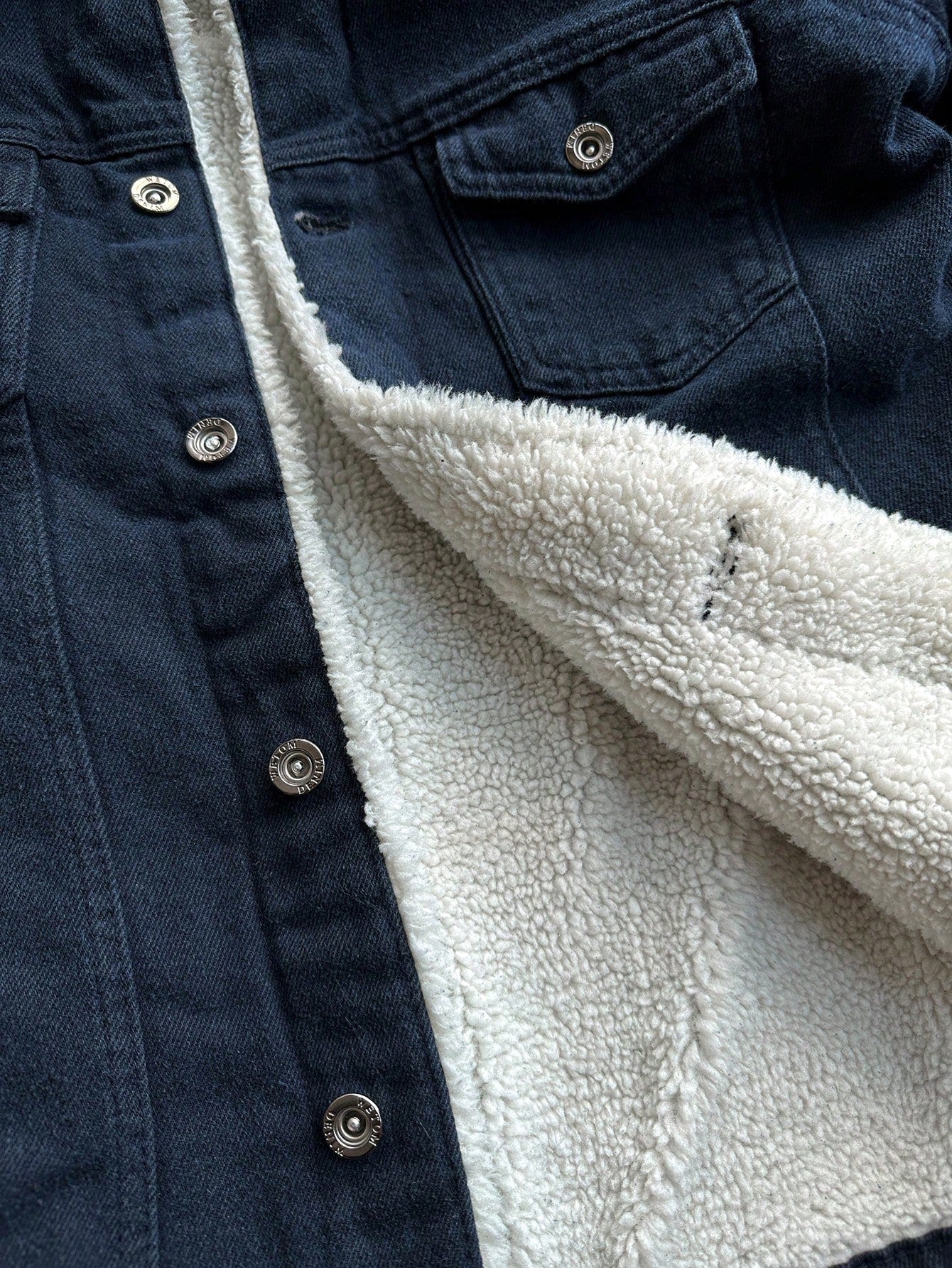 This stylish black denim jacket with a sherpa-lined collar is a timeless wardrobe essential, blending comfort and rugged charm for a versatile look. Its sleek fit and warm lining make it an ideal choice for cooler days.