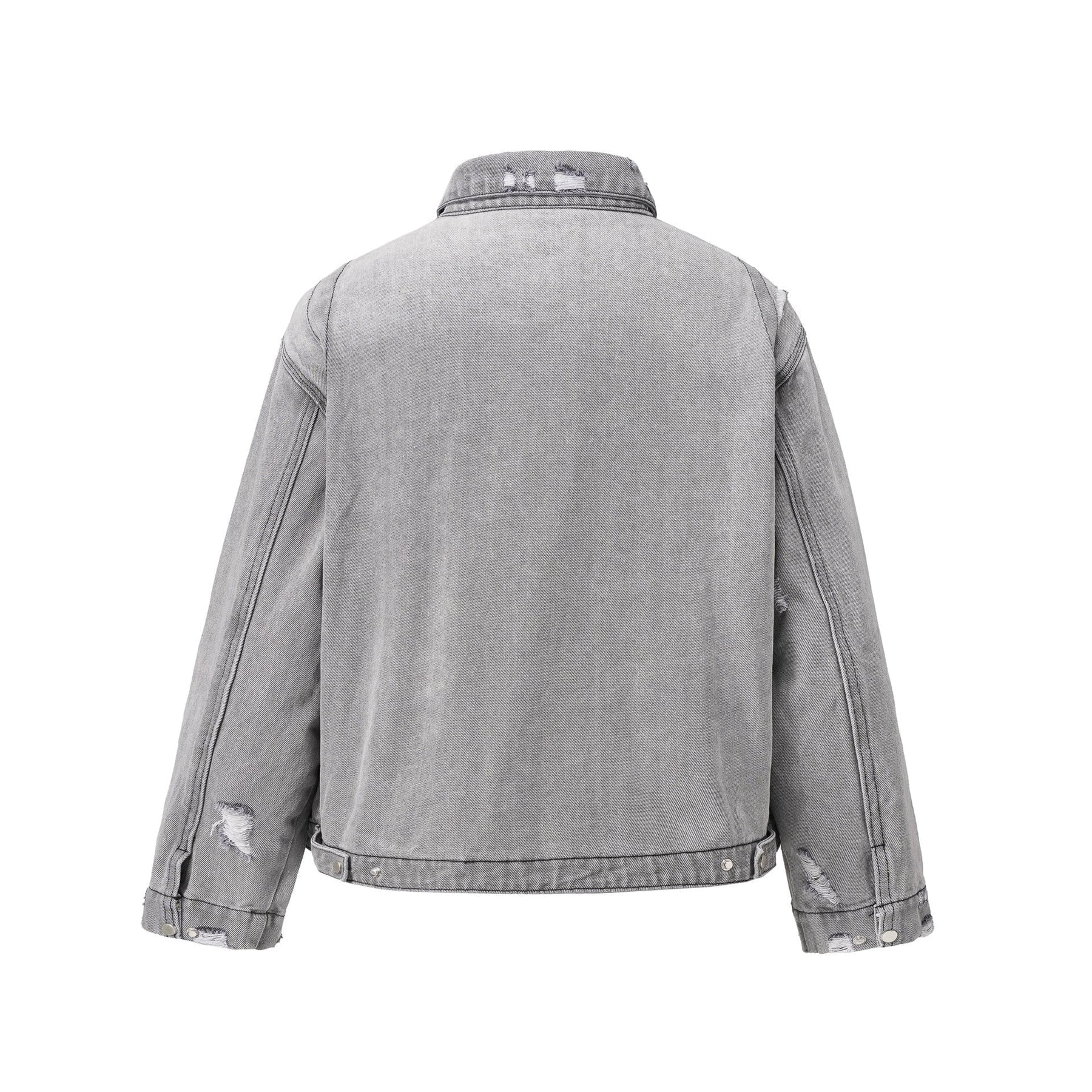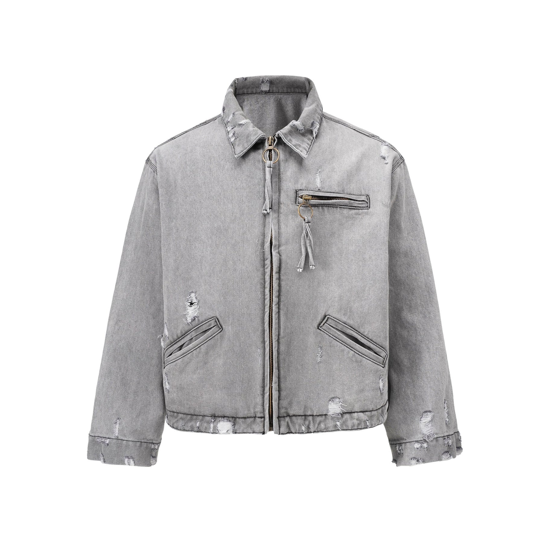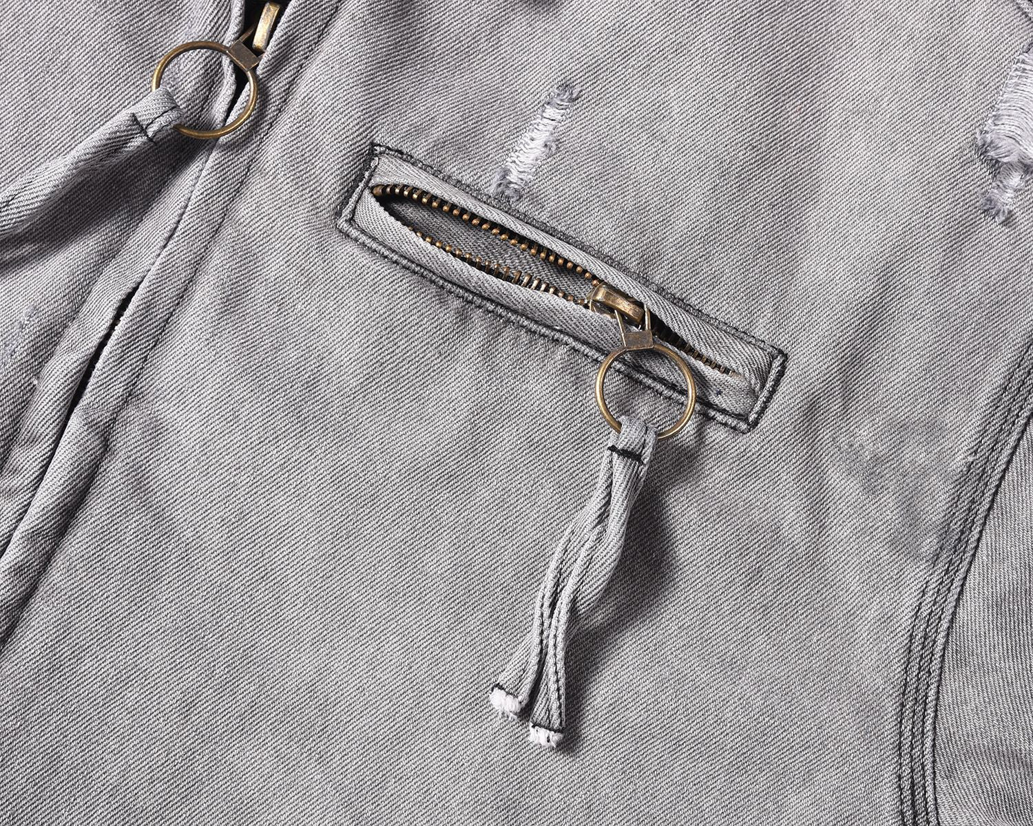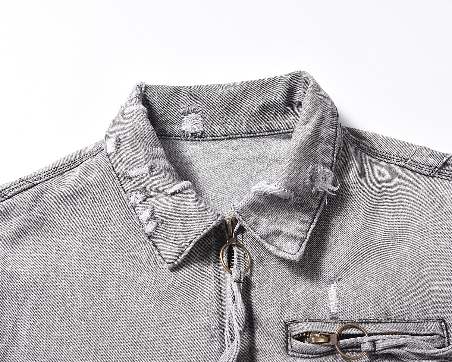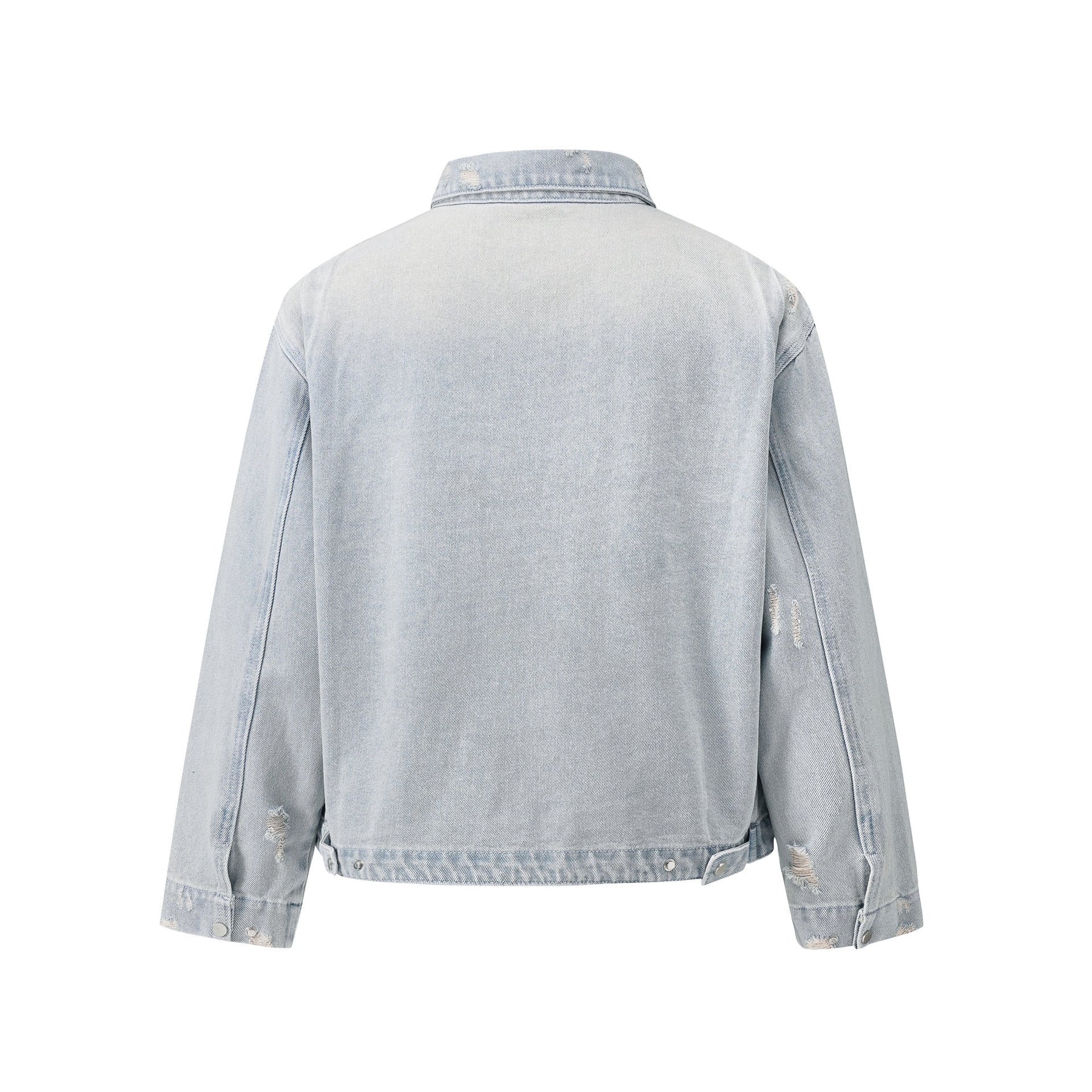 Add an edge to your wardrobe with this light blue distressed denim jacket. Featuring a relaxed fit and bold zipper details, it’s the perfect statement piece for casual, streetwear-inspired looks.